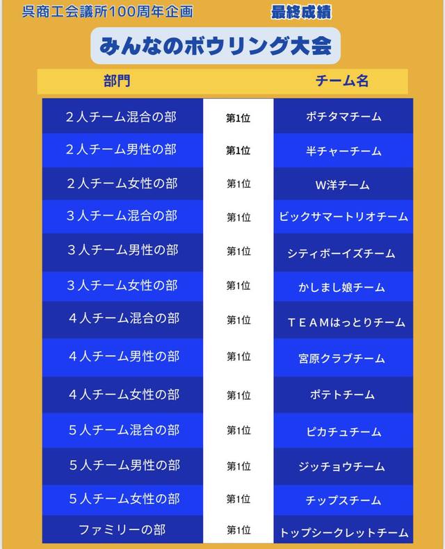 「呉商工会議所100周年記念企画みんなのボウリング大会最終成績」ならびに参加の御礼
