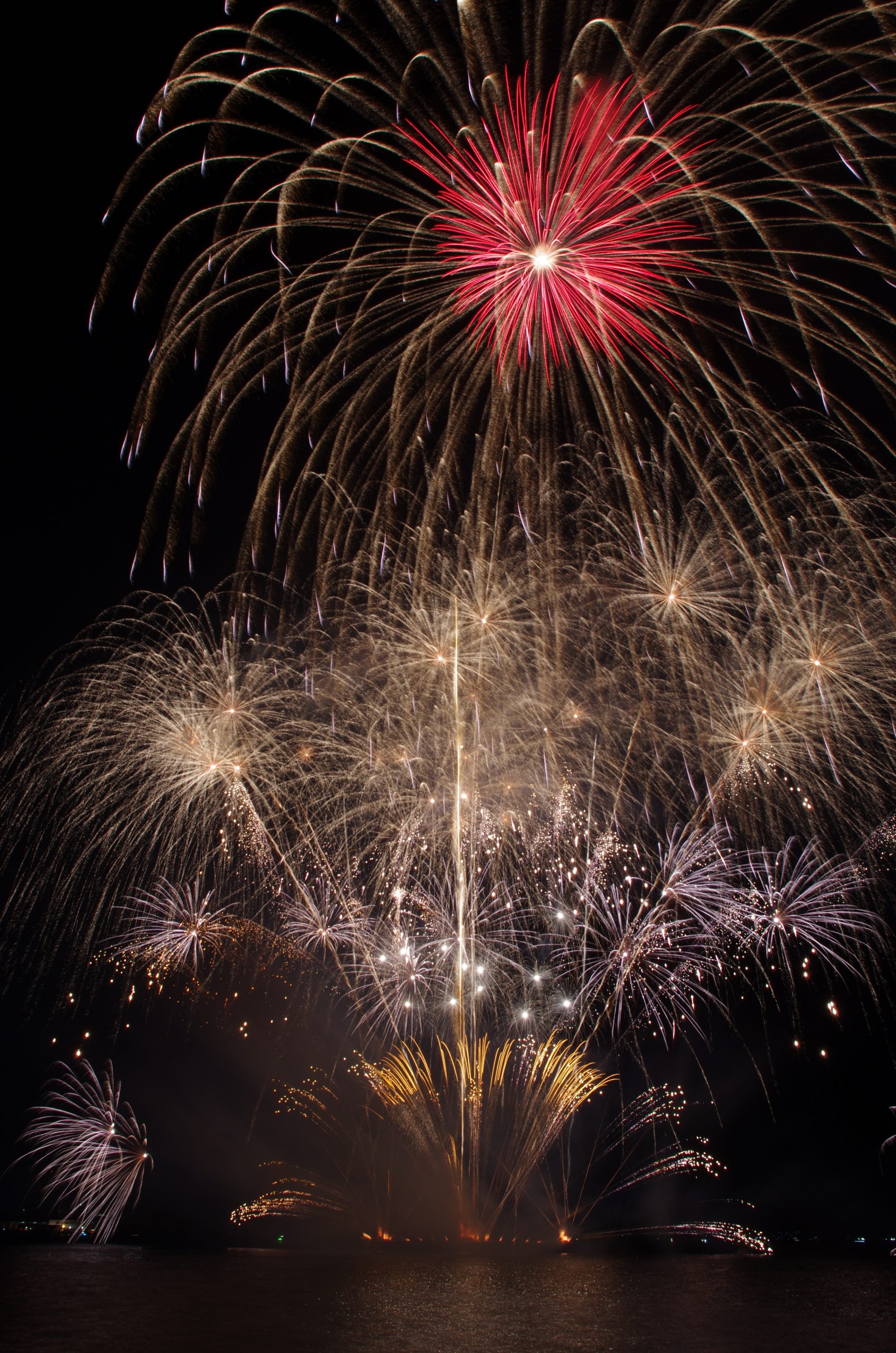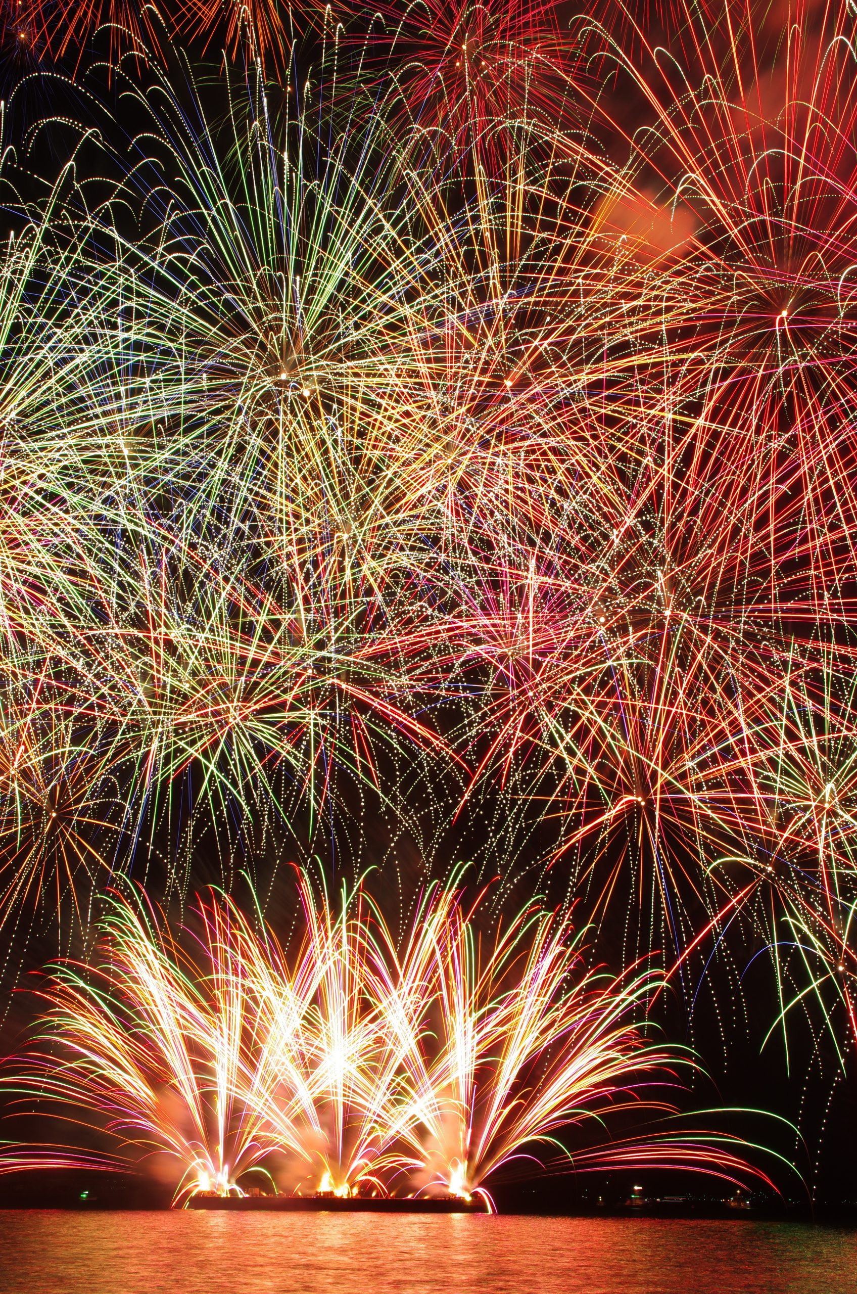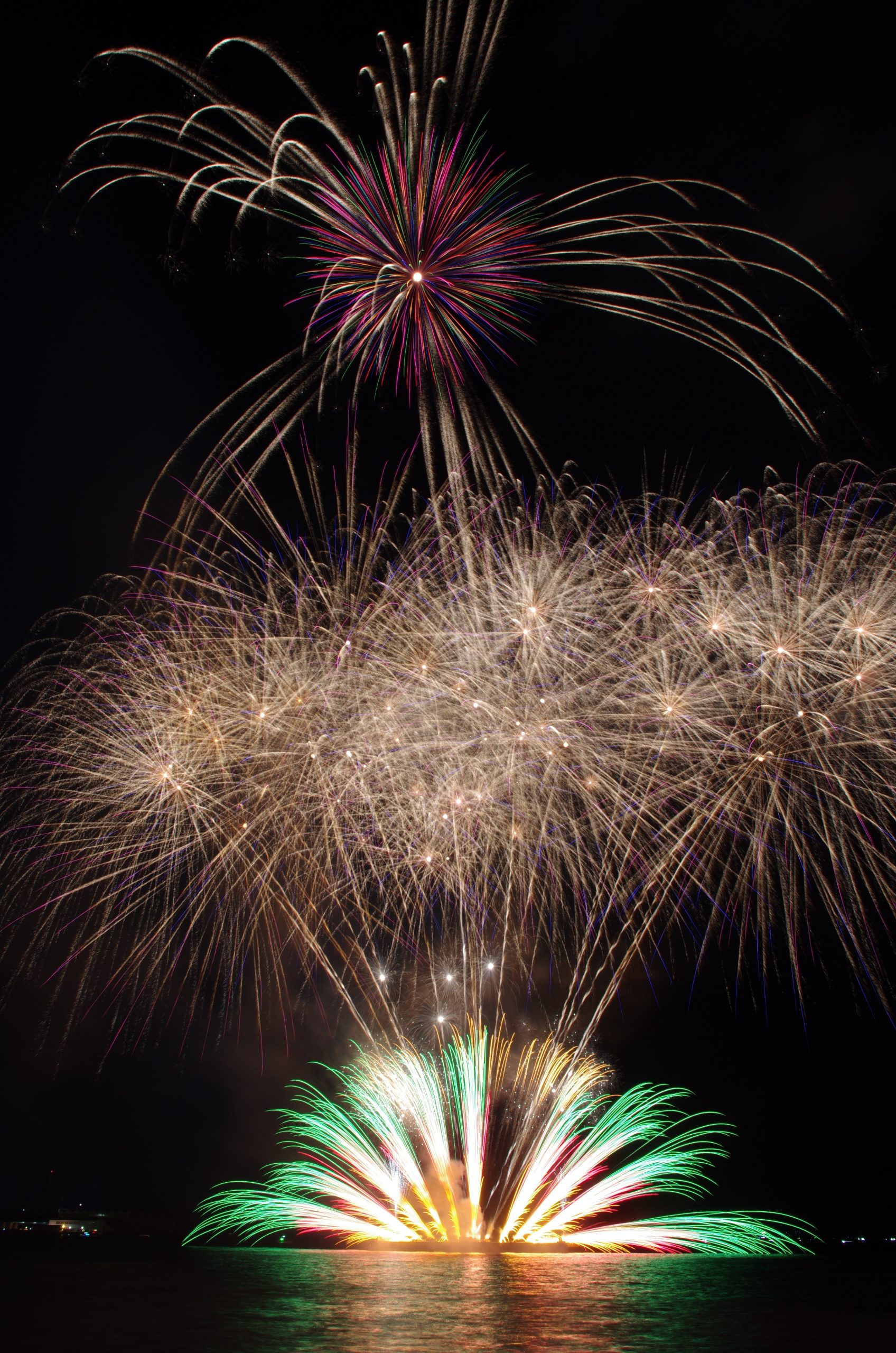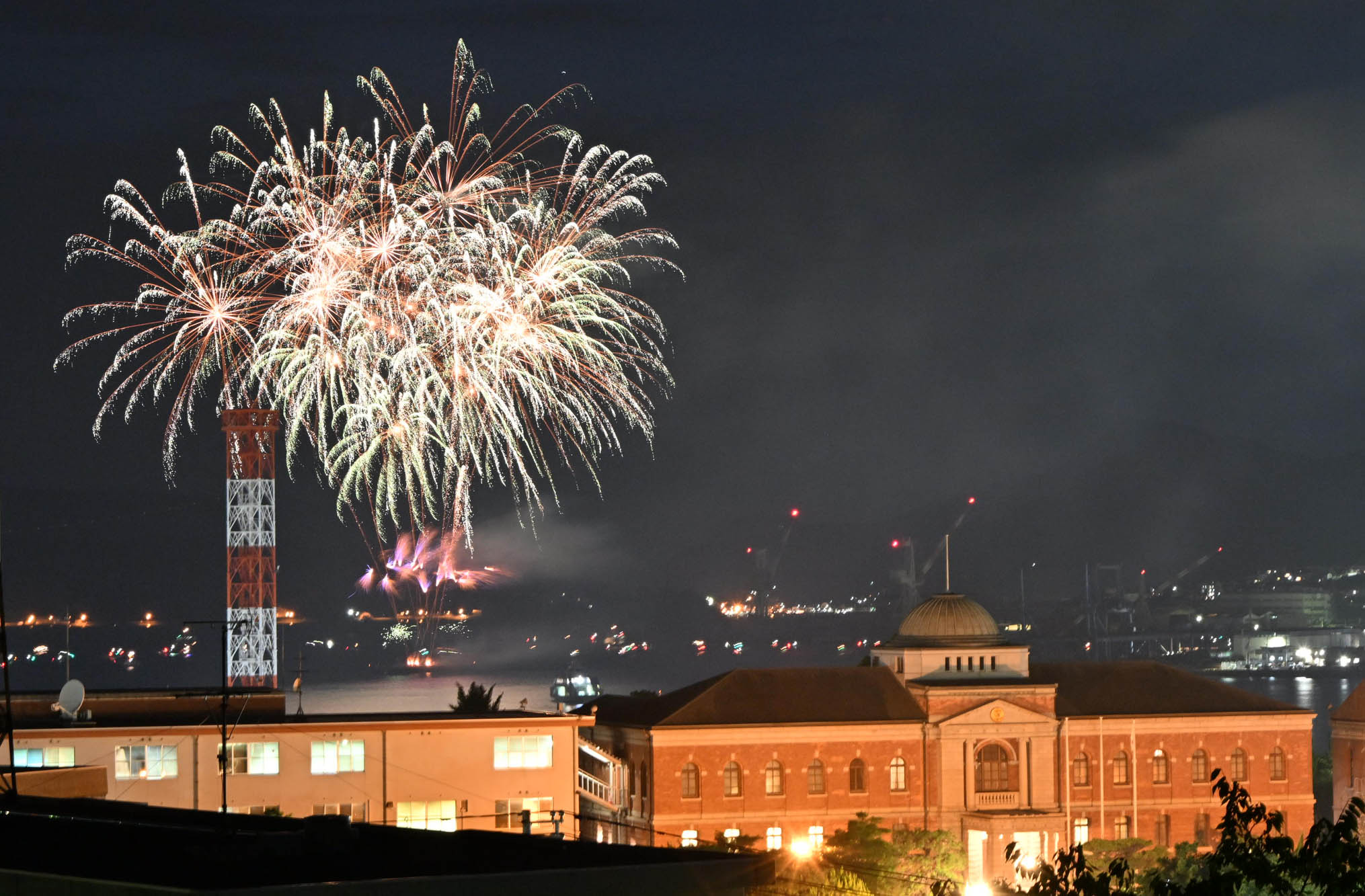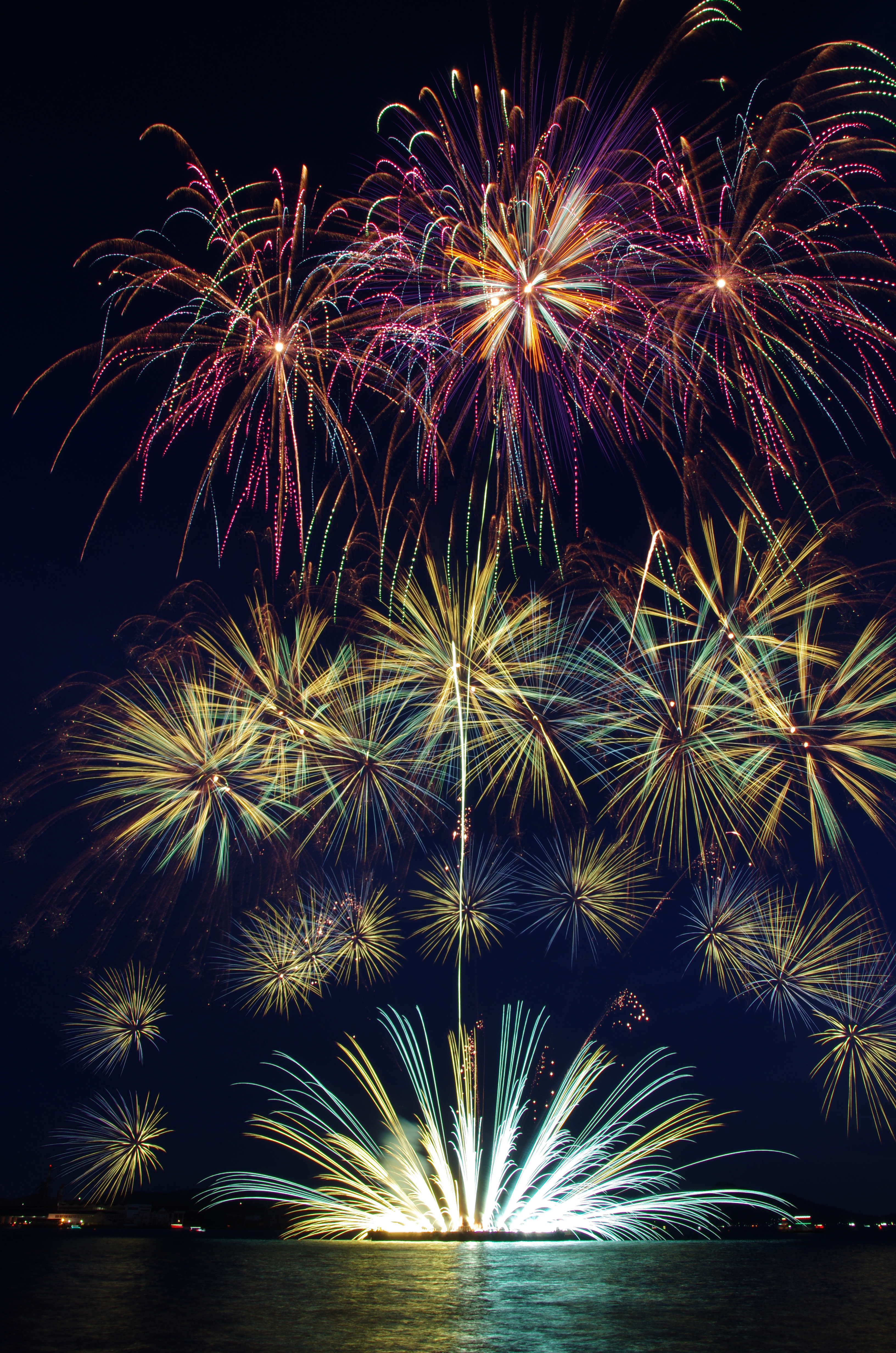 当日は天候に恵まれ、海上に設置した台船から、約2000発が午後8時より30分間打ち上げられた。