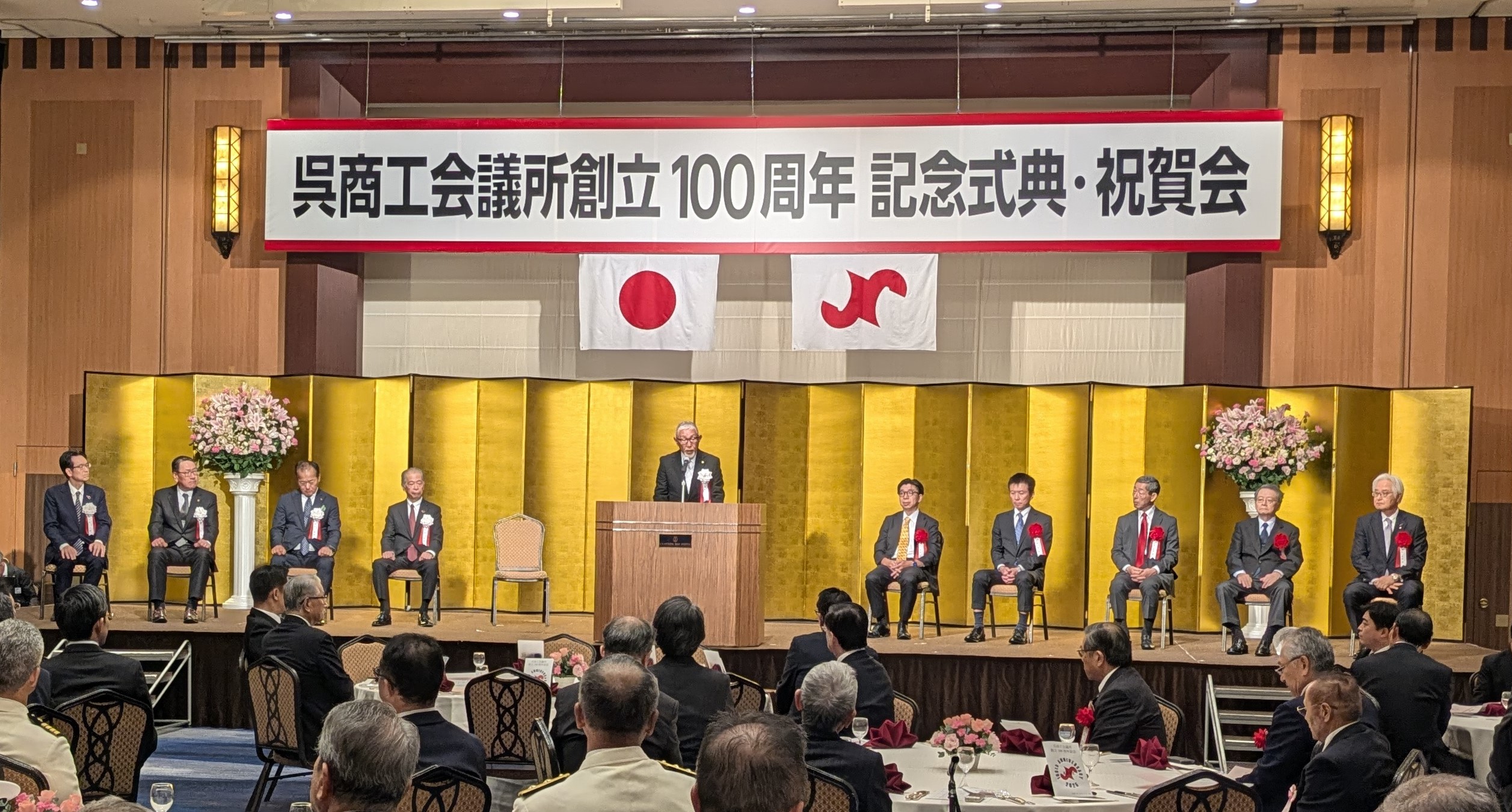 若本祐昭会頭が式辞を述べ、来賓の中国経済産業局 林揚哲局長や湯崎英彦広島県知事(代理)、新原芳明呉市長、日本商工会議所 小林健会頭、広島県商工会議所連合会 池田晃治会頭からそれぞれ祝辞を頂き、自由民主党の麻生太郎副総裁から祝辞としてビデオメッセージが上映された。