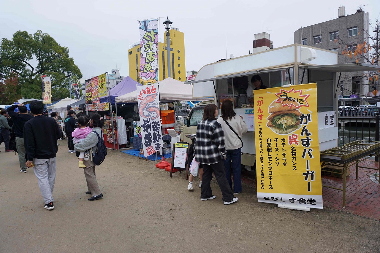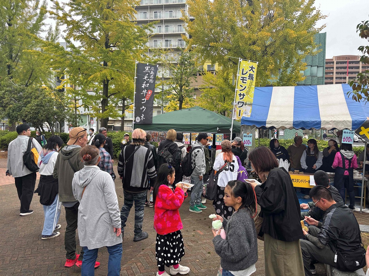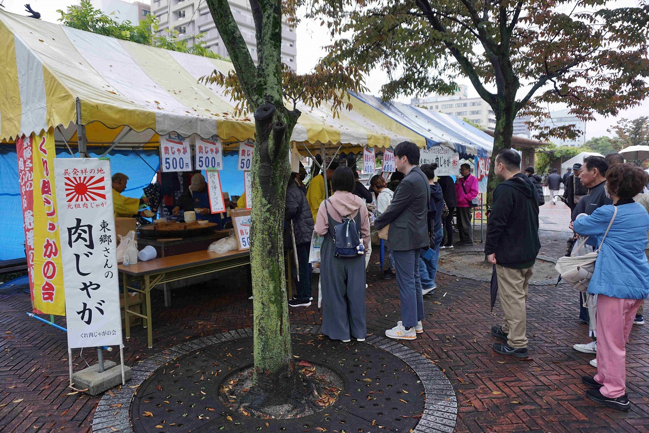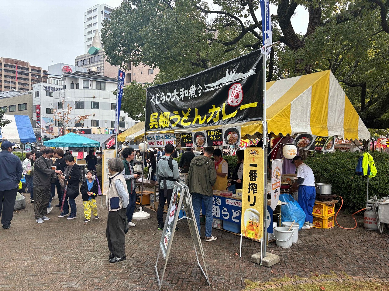 呉商工会議所創立100周年事業・「呉・大博覧会」事業『2025くれ食の祭典』【主催:呉まつり協会(呉商工会議所内)】を11月9日(日)蔵元通り公園一帯において、48ブースの出展者の協力を得て開催した。当日はあいにくの空模様となりましたが、たくさんの市民と来場者で賑わいをみせた。「肉じゃが」、「呉海自カレー」、「呉細うどんカレー」等には長い行列ができた。さらに、呉商業高校による、特産品の販売も行われた。